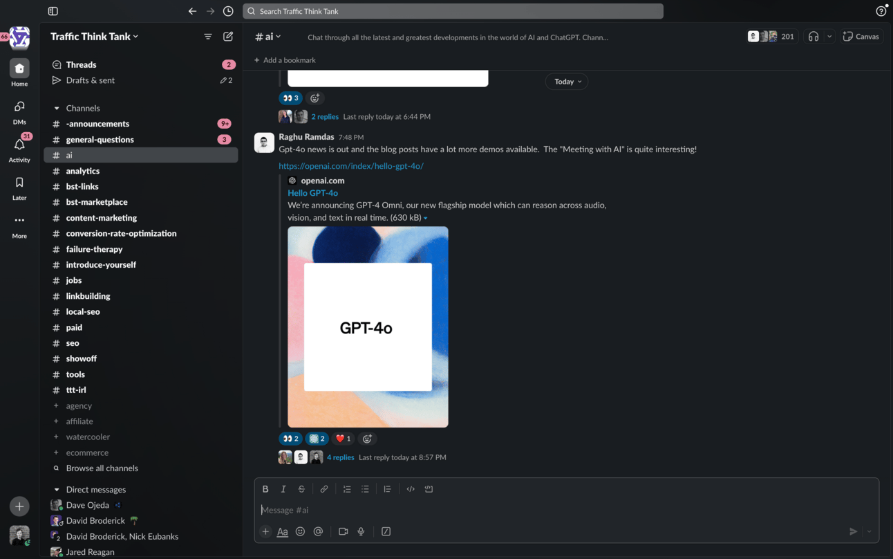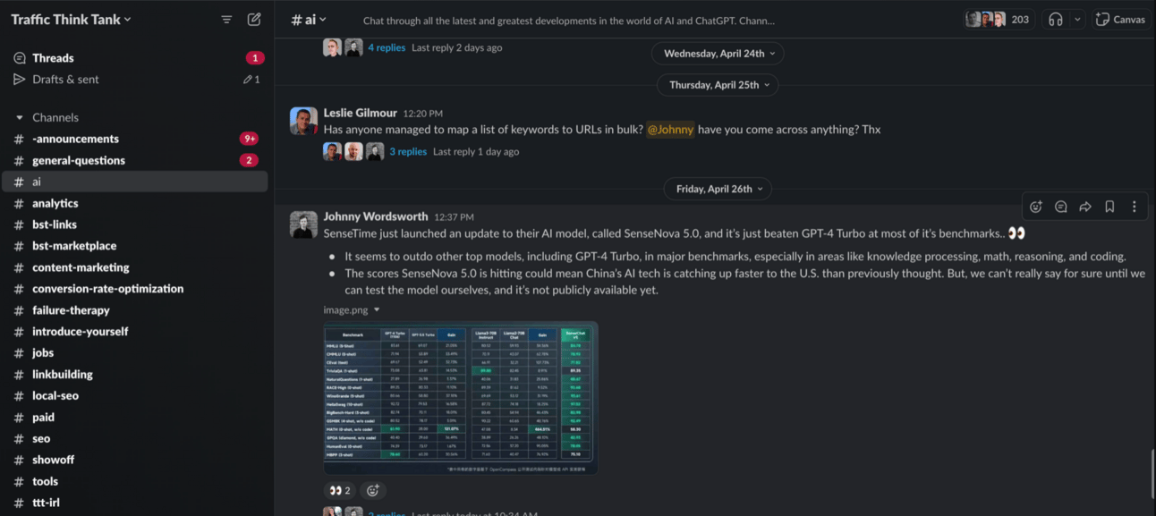 Here’s a few screenshots of the active Slack group where you can chat and ask questions about AI and SEO👇