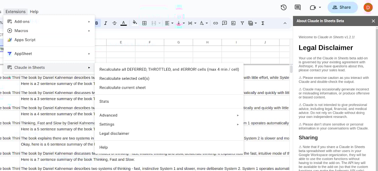 Claude Google Sheets Extension